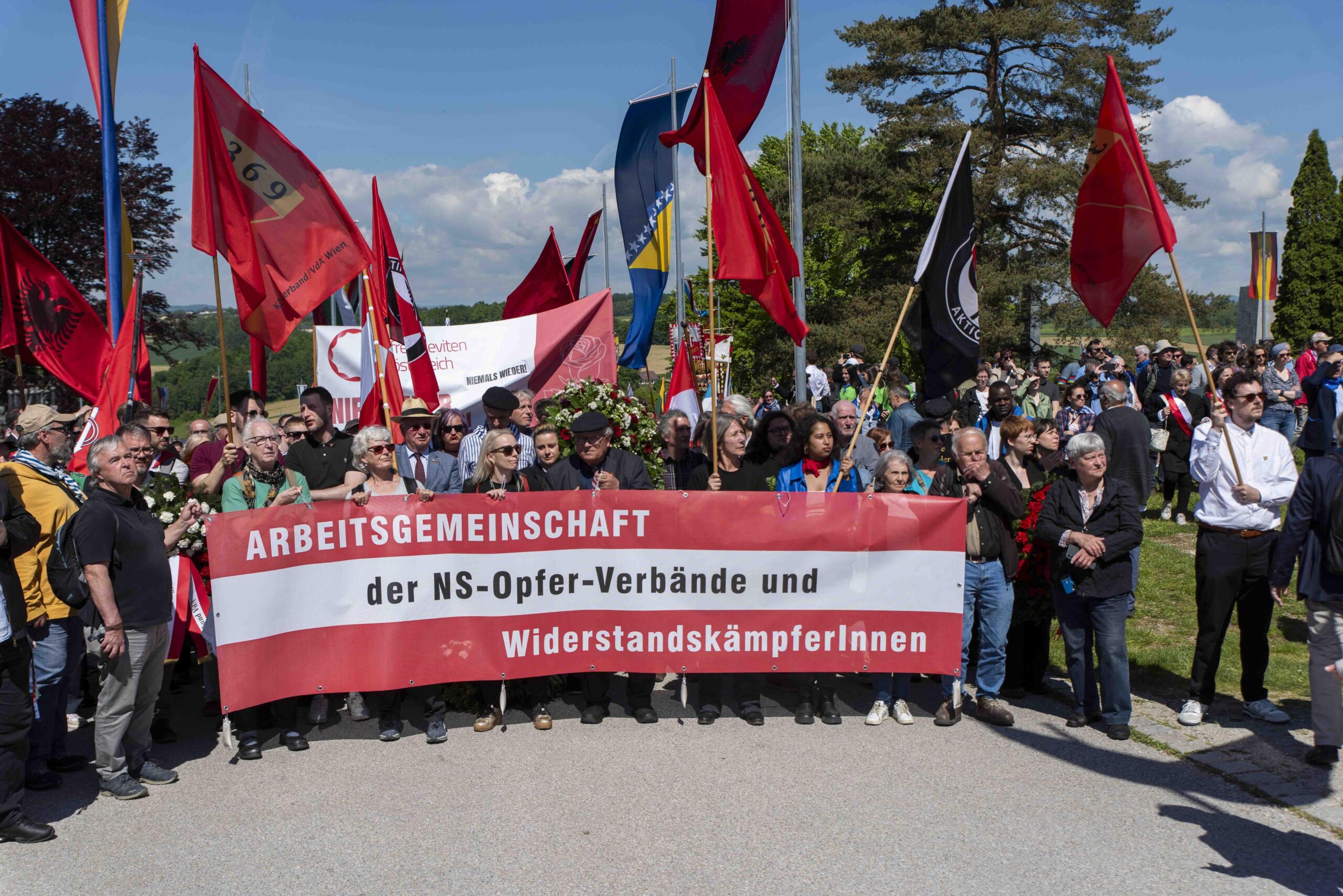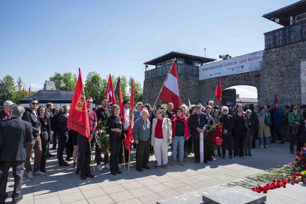 Gemeinsam mit unseren Kameradinnen der „Arbeitsgemeinschaft der NS-Opfer-Verbände und WiderstandskämpferInnen“ versammelten wir uns anschließend zum offiziellen Teil der Zeremonie. Es war erfreulich und ermutigend zu sehen, dass wir in diesem Jahr als großer, vielfältiger Block auftraten. Nach der Kranzniederlegung und dem offiziellen Gedenken blieb noch Zeit für Gespräche mit Delegationen anderer Organisationen sowie für den Austausch mit Freund*innen und Genoss*innen verschiedenster Initiativen und Institutionen.