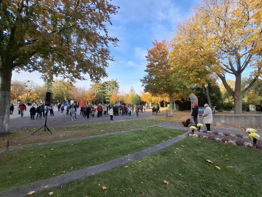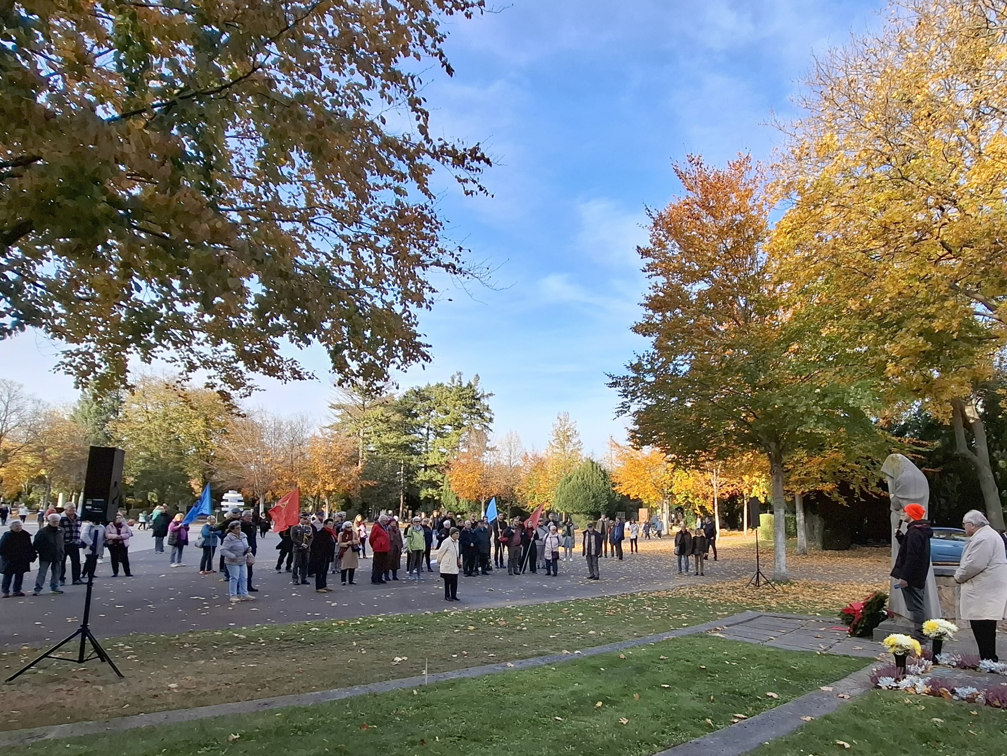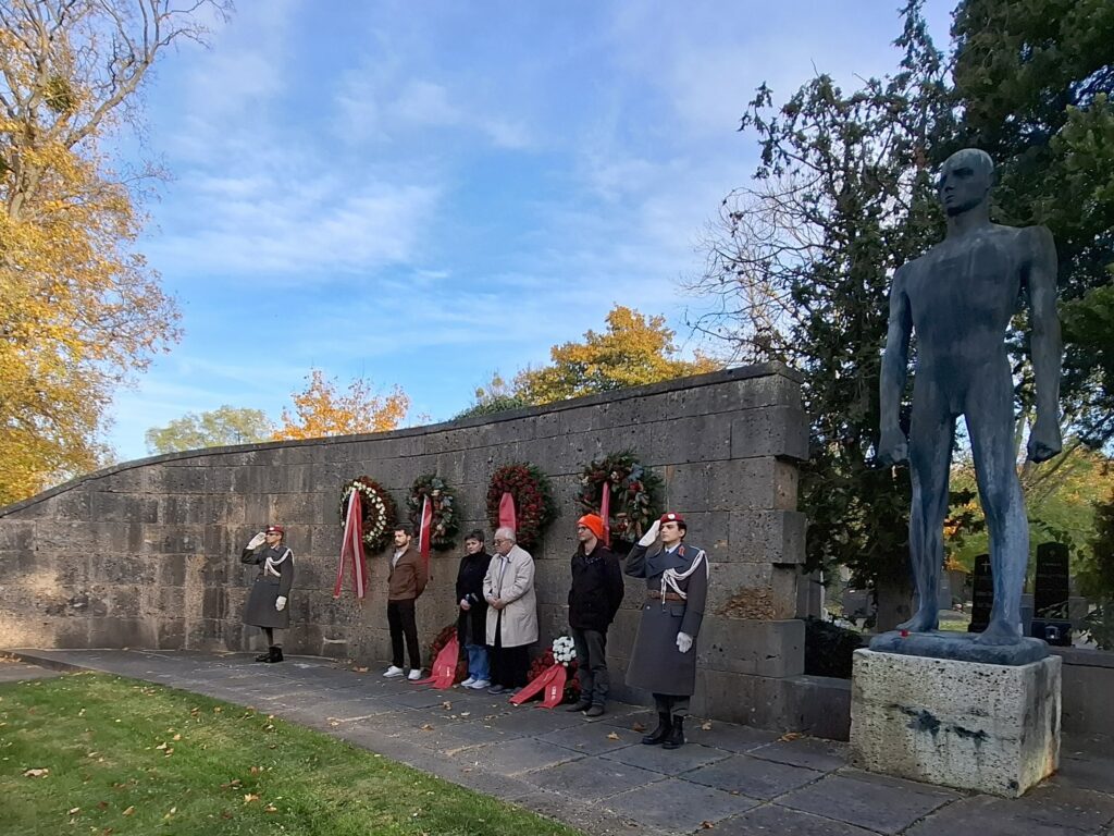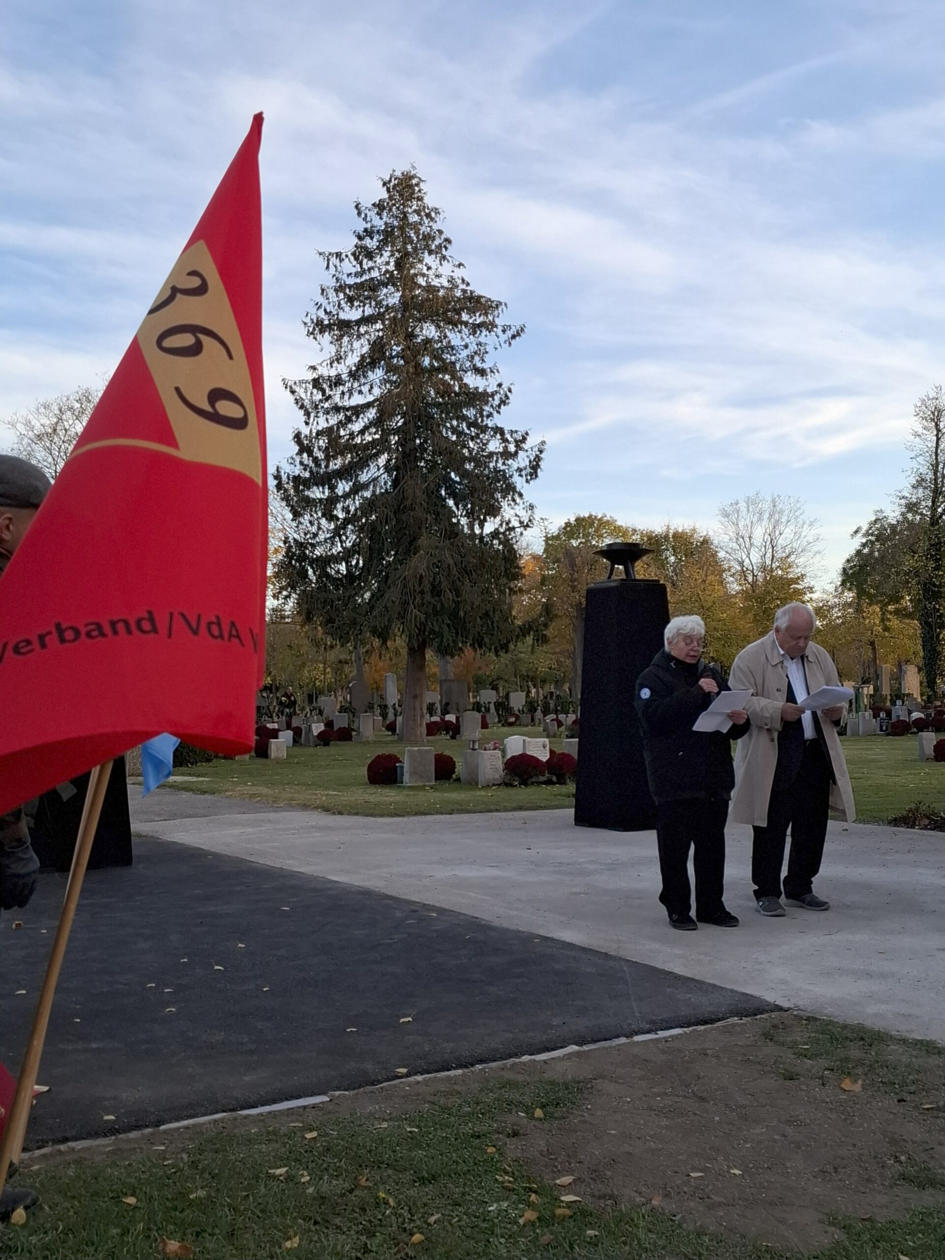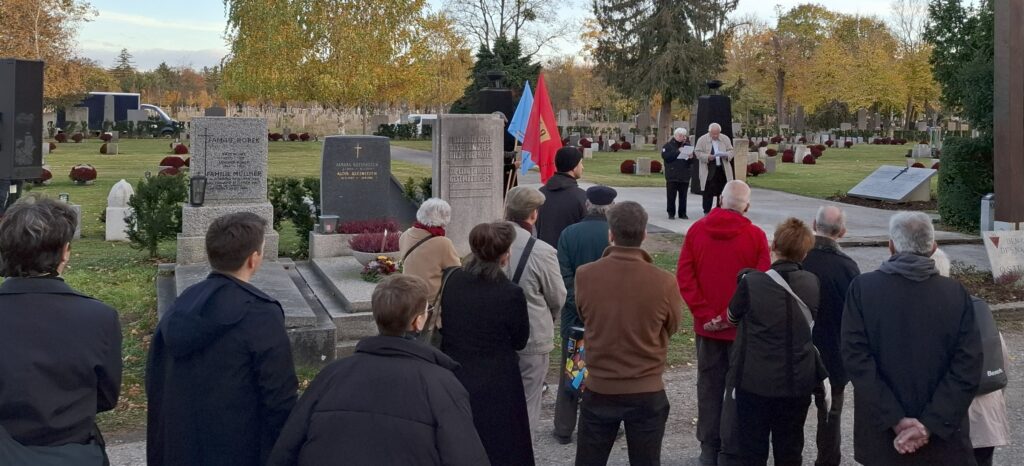 Rund 50 Kamerad:innen und Freund:innen folgten dem Aufruf. Die Gedenkfeier begann um 15.00 am Rundplatz der Gruppe 41 beim Mahnmal der Stadt Wien, dass den „Opfern für ein freies Österreich 1934–1945“ gewidmet ist. Wie immer blieben auch Besucher:innen des Zentralfriedhofs stehen um der Feier beizuwohnen. Kamerad Winfried Garscha begrüßte die Teilnehmer:innen, danach sprach Kamerad Mathias Lichtenwagner, überbrachte Grüße von Wiener und Bundesverband. Er ging auf die konfliktreiche Geschichte des Denkmals aber auch aktuelle Geschehnisse ein.