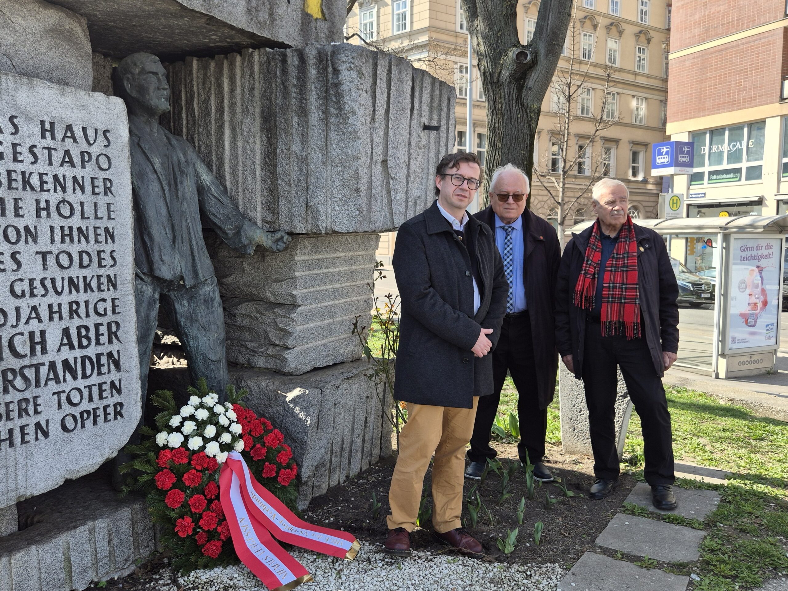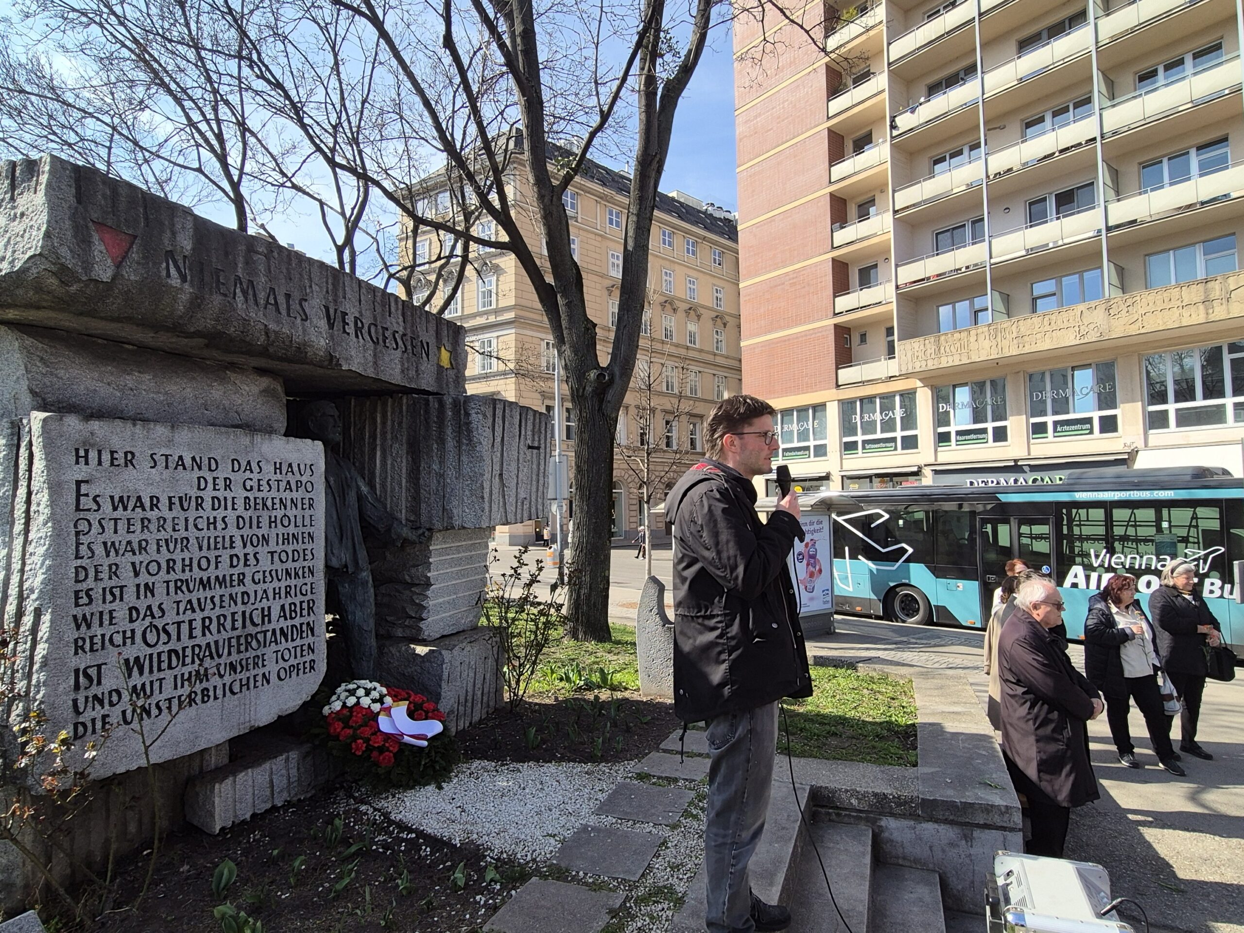 Beim anschließenden Gedenken vor dem Denkmal auf dem Morzinplatz hielt Mathias Lichtenwagner, Landessekretär des Wiener KZ-Verbands, eine Rede, die bei den anwesenden Schüler:innen sichtlich großen Anklang fand. Nach der Kranzniederlegung durch Vertreter:innen der Opferverbände ehrten Schüler:innen die Opfer der Gestapo mit Nelken.